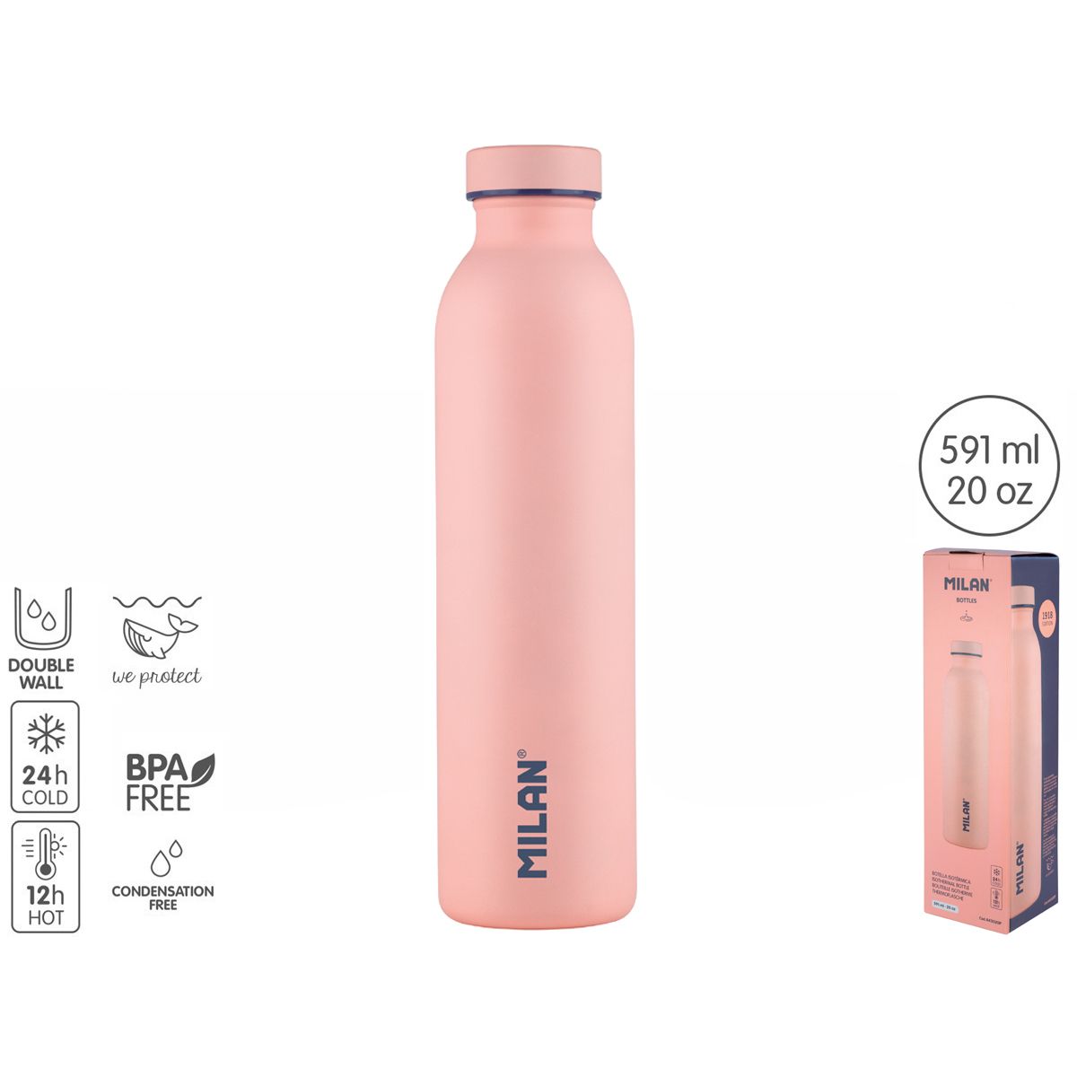 Butelka termiczna z kolekcji 1918, duża w kolorze różowym. Wykonana ze stali nierdzewnej. Posiada hermetyczną zakrętkę z uszczelką polipropylenową dla maksymalnej szczelności. Dwuwarstwowa izolacja próżniowa pozwala utrzymać temperaturę wewnątrz do 12 godzin dla płynów gorących i 24 godziny dla płynów zimnych. Zapobiega także kondensacji na zewnętrznej powierzchni, dzięki czemu butelka nie ?#8222poci?#8221 się w dłoni lub torbie i zawsze pozostaje w temperaturze pokojowej. Może służyć jako termos na gorące napoje. BPA free: zachowuje smak i świeżość wody. Antypoślizgowa podstawa silikonowa. Przed pierwszym użyciem wypłucz w czystej wodzie 3 razy. Po każdym użyciu umyj ręcznie i wypłucz. Przechowuj otwartą. Nie zalewaj wrzątkiem. Nie wlewaj: alkoholu, tłuszczu, produktów mlecznych, napojów gazowanych. Nie myj w zmywarce, nie zamrażaj, ani nie używaj w kuchence mikrofalowej. Pamiętaj!!! Stosowanie butelek wielokrotnego użytku przyczynia się do zmniejszenia zużycia plastikowych butelek jednorazowego użytku. Pojemność: 591 ml. Wysokość 26,2 cm. Średnica: 6,85 cm. Waga: 0,27 kg.