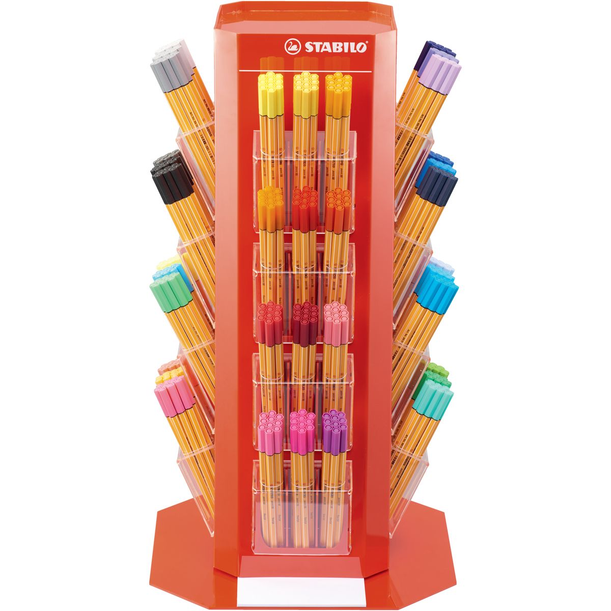 Niezaprzeczalny nr 1 wśród cienkopisów od 1977 r. W każdej sekundzie sprzedają się 4 cienkopisy point 88 w Europie. Uniwersalny cienkopis do pisania, podkreślania, kreślenia i kolorowania. Mocna, oprawiona w metal końcówka jest odporna na złamania i rozwarstwienia, co gwarantuje wysoki komfort pisania aż do całkowitego wyczerpania tuszu. Grubość linii ? 0,4 mm. Wentylowana skuwka umożliwia oddychanie w przypadku nagłego połknięcia. Jedyny cienkopis dostępny aż w 47 kolorach oraz w kompletach. Tekturowy display o wymiarach: 144 x 266 x 355 mm. Zawartość 200 szt. w 20 kolorach: po 5 szt. 32, 43, 44, 45, 54, 57, 63, 89, 94, 96; po 10 szt. w kolorach: 13, 50, 51, 55, 56, 58; po 20 szt. 36, 40, 41; 30 szt. w kolorze 46; 6 kompletów w etui po 6 szt.; 6 pustych etui na 6 szt. cienkopisów.