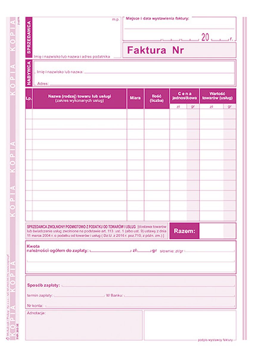 Seria: Faktura dla podatników zwolnionych z podatku VAT