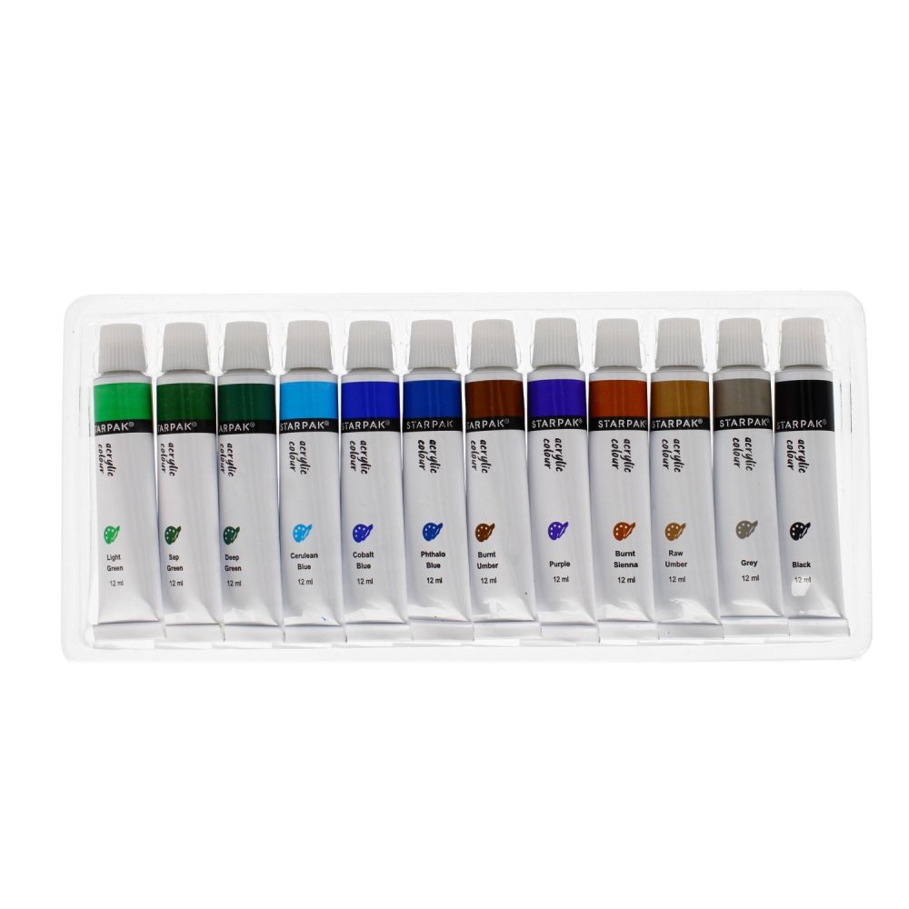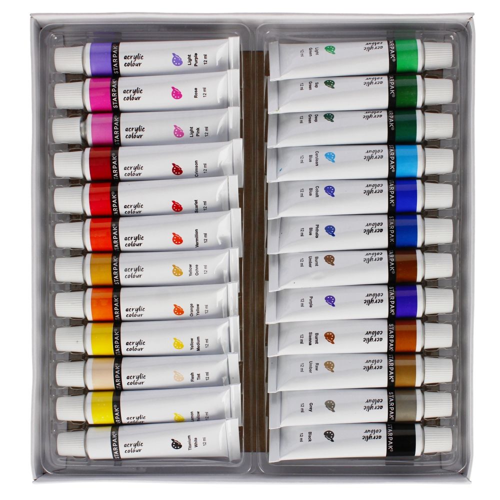 Zalety produktu: Farby akrylowe 24 kolory w tubkach 12 ml STARPAK Trwałe i szybkoschnące farby kryjące odporne na blaknięcie. Duża trwałość. Duża swoboda w doborze i mieszaniu barw. Farby nieprzeźroczyste, odpowiednie do nauki malowania. Można nimi malować papier, drewno, płótno oraz tkaniny. Zapoznaj się również z innymi produktami Starpak Farby odpowiednie do malowania techniką klasyczną. Farby są bardzo wydajne. Nieodpowiednie dla dzieci poniżej 3 lat. Wymiary opakowania wys.x szer. x gł. cm 21x26x2. Waga opakowania kg. 0,45 kg. Pakowane w kartonie po 6/24 szt.