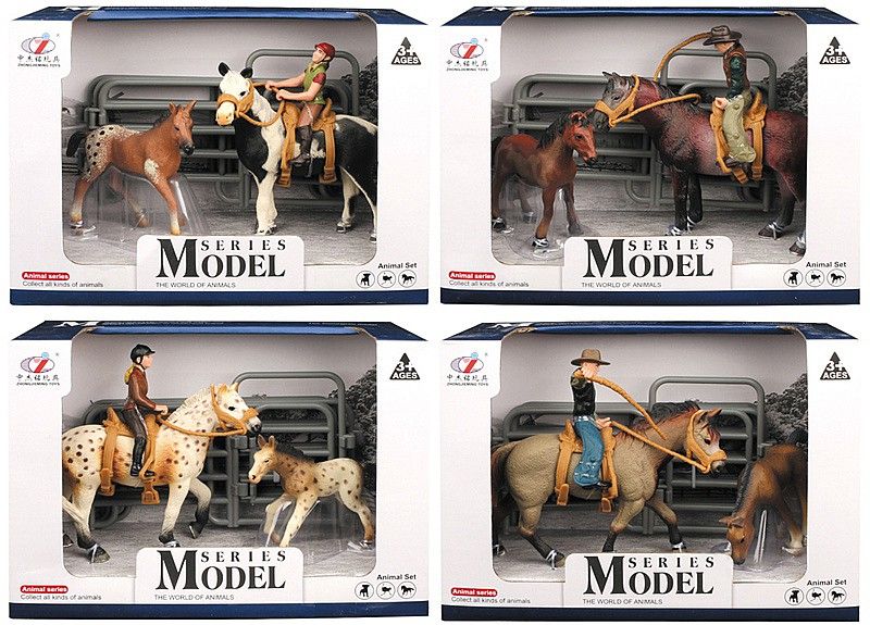 zestaw stadnina, 2 konie, jeździec, zagroda, akcesoria; 23x10x16,5cm, W/B