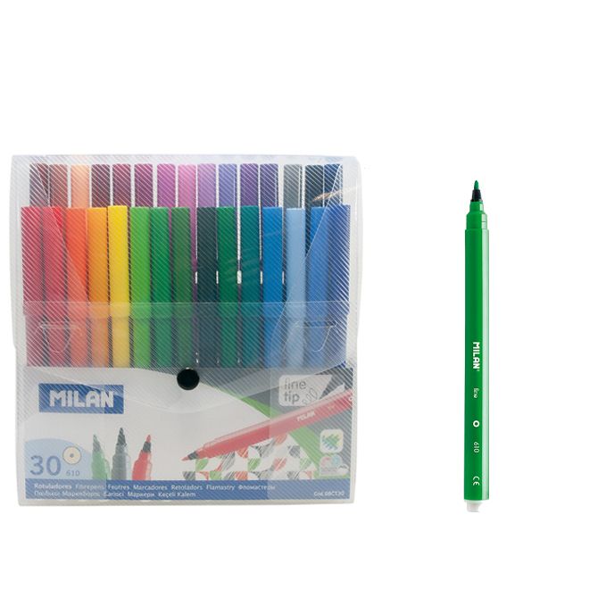 30-kolorowy zestaw flamastrów w elastycznym, przezroczystym etui. Flamastry posiadają cienką końcówkę o średnicy 2 mm. Szczególnie nadają się do rysowania konturów i pisania krótkimi pociągnięciami. Tusz na bazie wody tworzy jaskrawe i intensywne kolory, które można ze sobą mieszać. Tusz można łatwo wyprać z większości tkanin (moczyć tkaninę w zimnej wodzie przez godzinę, a następnie prać w pralce w niskiej temperaturze). Bezpieczna wentylowana skuwka umożliwia oddychanie w przypadku połknięcia. Flamastry MILAN są zgodne z europejskimi i amerykańskimi normami bezpieczeństwa. Nie zawierają ftalanów, metali ciężkich i innych substancji toksycznych. Są bezpieczne dla dzieci. Rozmiar flamastra: 16,5 x ø 1,04 cm. Rozmiar opakowania: 19,5 x 19 x 2 cm.