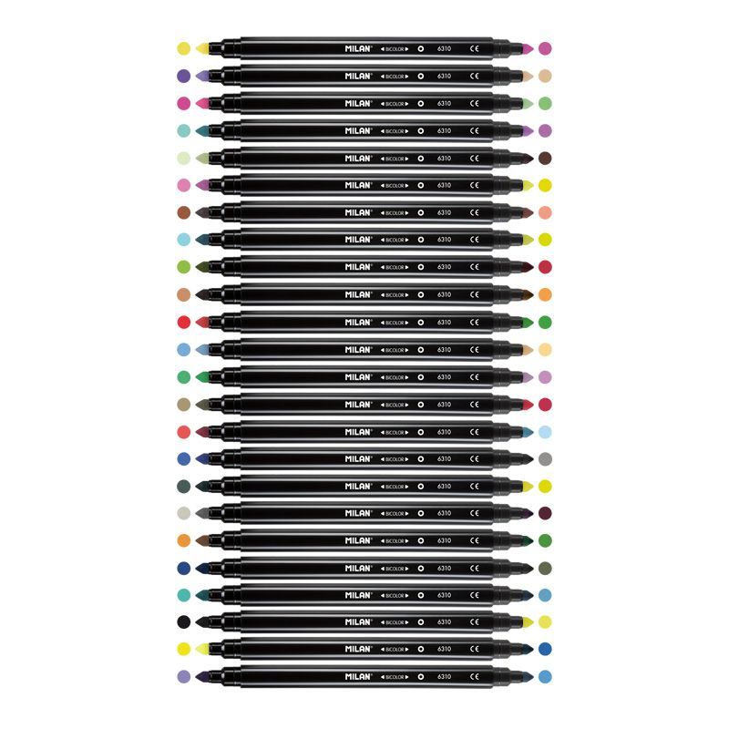Flamastry dwustronne (24 flamastry = 48 kolorów) z wytrzymałą i elastyczną stożkową końcówką o średnicy 5 mm, która nie wpada do środka nawet przy silnym nacisku. Po chwilowym odkształceniu końcówka zawsze wraca do pierwotnego kształtu. Pozwala na rysowanie cienkich i grubych linii od 0,75 mm do 3 mm. Tusz na bazie wody tworzy jasne, łatwe do nakładania kolory, które można ze sobą mieszać. Tusz można łatwo wyprać z większości tkanin (moczyć tkaninę w zimnej wodzie przez godzinę, a następnie prać w pralce w niskiej temperaturze). Bezpieczna wentylowana skuwka umożliwia oddychanie w przypadku połknięcia. Flamastry MILAN są zgodne z europejskimi i amerykańskimi normami bezpieczeństwa. Nie zawierają ftalanów, metali ciężkich i innych substancji toksycznych. Są bezpieczne dla dzieci. Rozmiar flamastra: 16,5 x Ø 1,04 cm.