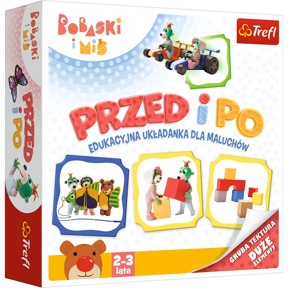 Przed i po to dydaktyczna układanka dla najmłodszych, ilustrowana kolorowymi obrazkami przedstawiającymi bohaterów serialu Bobaski i Miś. Edukacyjna gra, przeznaczona dla dzieci w wieku od 2 lat, uczy maluchy łączenia w pary elementów historyjek. Dopasowując elementy, dziecko zauważa związki przyczynowo-skutkowe, rozwija mowę opowieściową i poznaje otaczający je świat. Duże elementy oraz gruba tektura zapewniają bezpieczeństwo zabawy i idealnie dopasowują się do małych rączek. Zestaw składa się z 24 kolorowych kafelków oraz instrukcji opisującej różne warianty zabawy, takie jak układanka, historyjki, memos oraz zgadywanka..