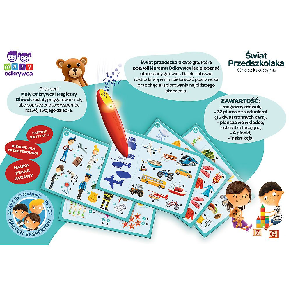 Świat Przedszkolaka to gra edukacyjna dla dzieci, dzięki której Mali Odkrywcy z chęcią poznają najbliższe otoczenie. To co bliskie, również może być ciekawe i fascynujące! Magiczny Ołówek zaprasza do wspólnej zabawy! Już za moment poznasz odpowiedzi na nurtujące pytania: jak nazwać atrakcje, z których korzystam na placu zabaw? Do czego służy rower, a kto kieruje strażą pożarną? Pięknie ilustrowana plansza z tarczą losującą, kolorowe plansze i wciągające zadania to nieograniczone możliwości zabawy, które w naturalny sposób zapoznają Cię z najbliższym otoczeniem! Rozgrywka w grę planszową a może quiz? Sam wybierasz najlepszą dla Ciebie formę zabawy! Świat Przedszkolaka to wyjątkowa gra edukacyjna, dzięki której dziecko jeszcze lepiej pozna swoje najbliższe otoczenie, a także zaznajomi się z podstawowymi pojęciami z życia codziennego.