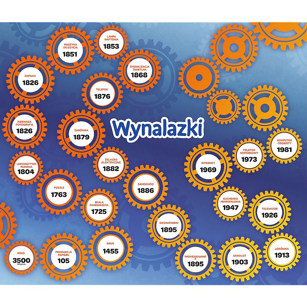 Wynalazki to edukacyjna gra dla dzieci, która łączy quiz, grę planszową, układankę i memos oraz uczy o przełomowych odkryciach w dziejach ludzkości w przyjemny sposób.