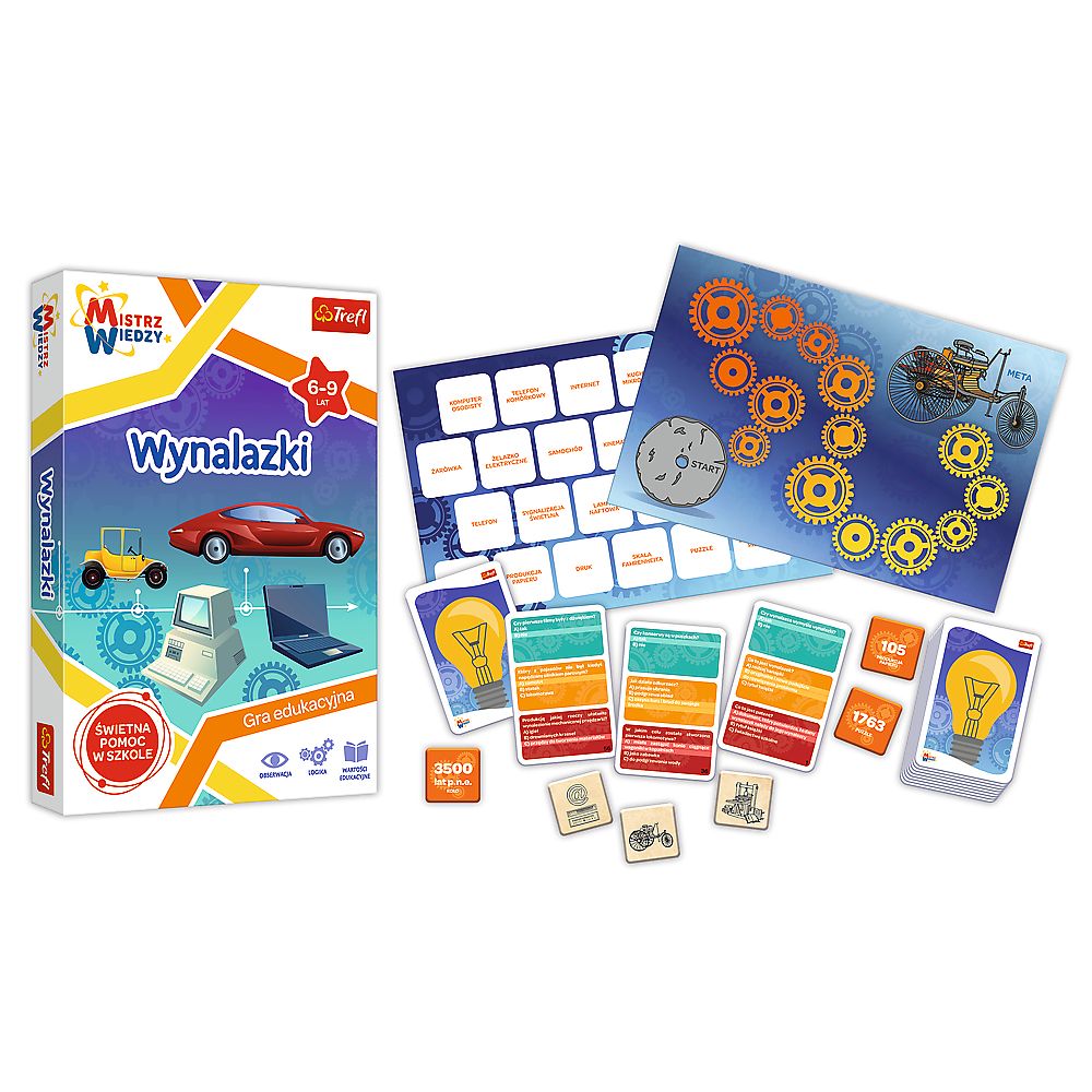 Wynalazki to gra edukacyjna już dla dzieci w wieku 6-9 lat, w której podczas dobrej zabawy dzieci poznają niesamowite wynalazki, które zmieniły nasz świat. Gra dla dzieci stanowi połączenie quizu, gry planszowej, układanki i memos oraz obejmuje tematy i treści poruszane w edukacji wczesnoszkolnej.