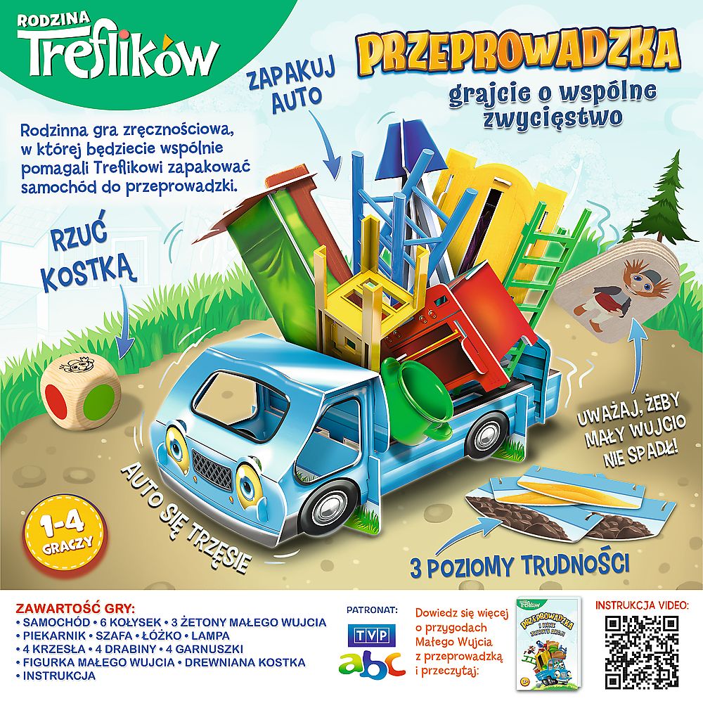 Przeprowadzka to rodzinna gra zręcznościowa. Wybierzcie 1 z 3 poziomów trudności i pomóżcie Treflikom przeprowadzić Małego Wujcia do nowego domu!