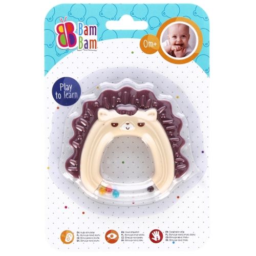 GRZECHOTKA JEŻYK na kółkach BAM BAM przeznaczona dla niemowląt od urodzenia. W subtelnej, pastelowej kolorystyce, o zróżnicowanej fakturze materiałów jak i różnorodnej formie, posiada elementy interaktywne zachęcające malucha do zabawy, a jednocześnie stymulujące rozwój jego zmysłów wzroku, słuchu oraz zdolności motorycznych. Mięciutki grzbiet jeżyka pozwalają masować nabrzmiałe dziąsła ząbkującego niemowlaka. Wymiary/waga/baterie: wymiary produktu (dł. x wys. x gł.)[cm]: 11x10x2, wymiary opakowania (dł. x wys. x gł.)[cm]: 14x21x3, waga produktu bez opakowania [kg]: 0,04 kg, waga produktu w opakowaniu [kg]: 0,06 kg, nie wymaga zasilania bateriami. Grzechotka przeznaczona dla dzieci w wieku: 0m+. Zabawka pakowana na blistrze.