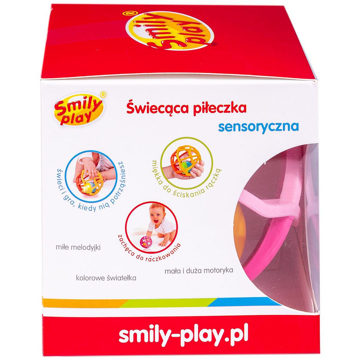 SMILY PLAY RÓŻOWA SENSORYCZNA PIŁKA GRZECHOTKA MIĘKKA ŚWIATŁO DŹWIĘK 0+Świecąca piłeczka sensorycznaPiłka grzechotka, to zabawka, która zaspokoi ciekawość naszego maluszka. Ze względu na bezpieczną charakterystykę zabawki, możemy ją podarować dziecku już w pierwszych dniach jego życia. W tym okresie największą rolę odgrywają dźwięki, percepcja wzrokowa i rozwój motoryczny dziecka.Ćwiczy paluszki-mała motoryka.Dzięki ruszającym się elementom rozwija wyobraźnię przestrzenną.Usprawnia percepcję wzrokową-kolorowe światełka.Dzięki miłym melodyjkom stymuluje rozwój zmysłu dotyku.Koi bolące dziąsła.Jak się bawić?Świeci i gra, kiedy nią potrząśniesz.Miękka do ściskania rączką.Zachęca do raczkowania.Grzechotka jest lekka, maluszek łatwo utrzyma ją w rączkach. Grzechocząca kula, która znajduje się wewnątrz piłki sprawi, że dziecko szybko się nie znudzi.SPECYFIKACJA:SP83659Wiek: 0m+EAN: 5905375836597Wymiary produktu: szer. 9,5 cm., wys. 9,5 cm., gł. 9,5 cm.Baterie: niewymienneBezpieczeństwo: EN71-1, EN71-2, ENT1-3, EN62115Marka : SMILY