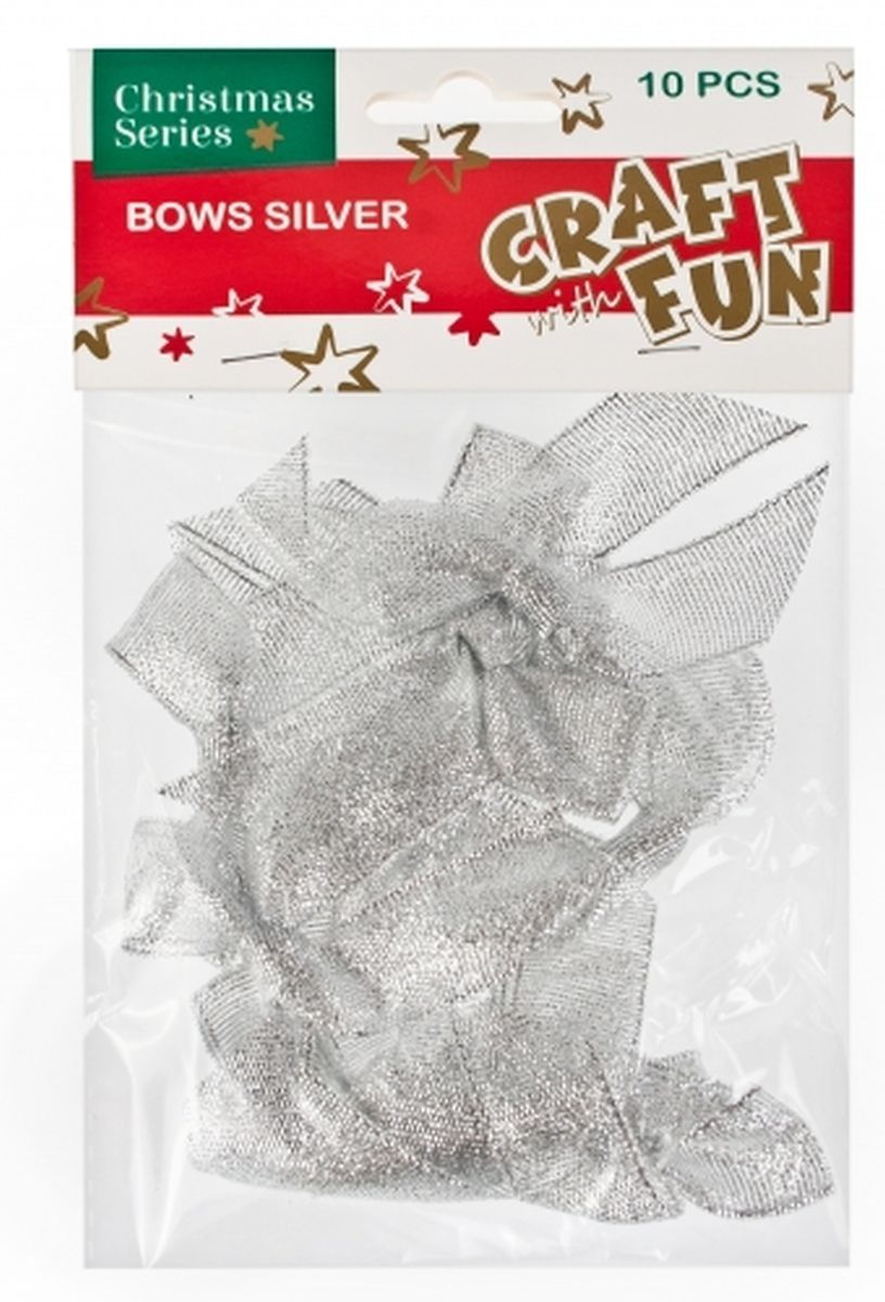 Opakowanie zawiera 10 sztuk srebrnych, materiałowych kokard. Przy pomocy tego zestawu możesz zaprojektować własne ozdoby świąteczne. Używaj tych produktów w połączeniu z innymi akcesoriami z serii Craft With Fun lub z innymi kompletami z serii.