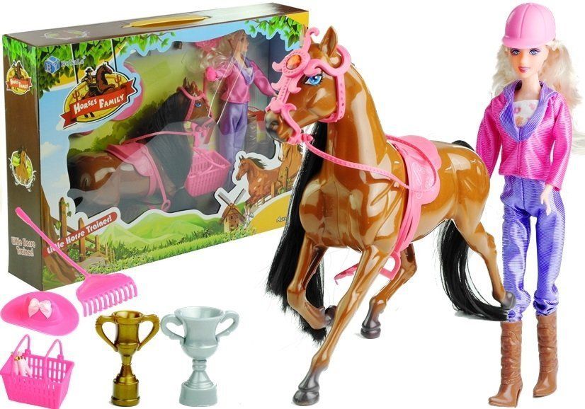 Zestaw stajnia - lalka i końPrezentowany zestaw składa się z dużego, brązowego konia, lalki-trenerki oraz wielu akcesoriów, które są niezbędne do pracy w stajni. Brązowy koń o imponującym rozmiarze posiada piękną grzywę i ogon w kolorze głębokiej czerni, które nie tylko błyszczą, ale są niebywale przyjemne i miękkie w dotyku. Dziewczynka będzie mogła przeczesywać grzywę specjalnym grzebieniem, by następnie móc ozdobić konia warkoczami lub innymi, wymyślonymi przez siebie fryzurami. Brązowy koń posiada miękkie siodło, które ozdobione jest eleganckimi ornamentami, a także uprząż z czerwonym brylantem, połączoną z lejcami. Lalka trenująca konia posiada smukłą sylwetkę i długie, lekko kręcone włosy. Ubrana jest w dwuczęściowy strój z połyskującego materiału, który można urozmaicić dołączonymi do zestawu kowbojkami na obcasie. W zestawie znajduje się czapka dżokejska, w którą można ubrać lalkę, gdy jeździ na koniu, oraz kapelusz z szerokim rondem, przydatny podczas szczotkowania i opieki nad zwierzęciem. Duży kosz piknikowy zmieści do środka przysmak konia, czyli marchewki, a także zdobyte trofea. W komplecie znajdują się również grabie, konieczne podczas sprzątania w stajni.Ten wieloelementowy komplet posiada wszystko, co jest potrzebne do udanej zabawy. Dziewczynka może zajmować się koniem, karmić i czesać go, a także organizować wesołe pikniki. Zestaw zapakowany jest w wielokolorowe kartonowe pudełko z witrynką, co sprawia, że doskonale nadaje się na prezent. Ze względu na rozmiar niektórych elementów, zabawka z certyfikatem CE przeznaczona jest dla dzieci, które ukończyły 3. rok życia.W skład zestawu stajni wchodzą:- brązowy koń,- lalka,- koszyk na akcesoria,- pęk marchewek,- kapelusz,- czapka dżokejska,- buty na obcasie,- szczotka,- grzebień,- grabie,- złoty i srebrny puchar.Wymiary poszczególnych elementów zabawki:- koń: 30 cm x 25 cm,- lalka: 30 cm,- kosz na akcesoria: 8,5 cm x 5,5 cm,- grabie: 15,5 cm.Wymiary opakowania:- 34,5 cm x 9 cm x 47 cm.