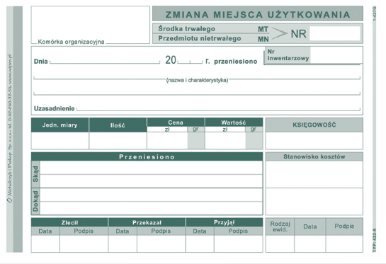 Strona główna » DRUKI » MICHALCZYK I PROKOP » DRUKI KASOWE, KSIĘGOWE I BANKOWE » MT zmiana miejsca użytkowania środka trwałego A6 422-5