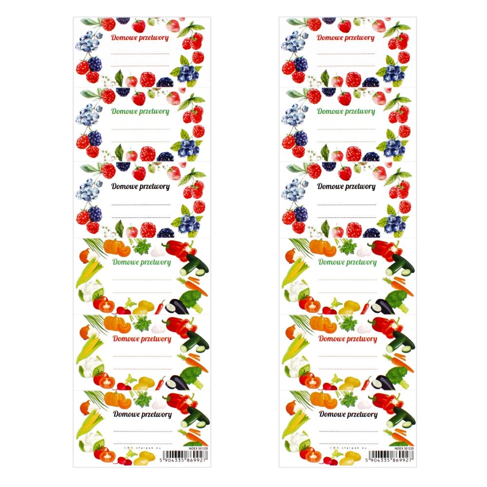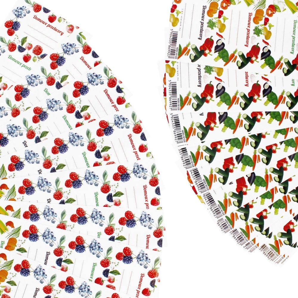 Zalety produktu: naklejki STARPAK na przetwory Owoce/Warzywa. Na listku znajduje się 6 naklejek, naklejki pozwalają na opisanie przetworów co ułatwi ich łatwiejszą segregację i ułożenie na półkach w swojej spiżarni Zestaw kolorowych naklejek na przetwory z kolekcji STARPAK. Zapoznaj się również z innymi produktami STARPAK Zawartość opakowania: 25 arkuszy po 6 szt. naklejek. Naklejki wykonane z papieru. Wymiary/waga: wymiary produktu wys. x szer. cm : 23x7, waga produktu w opakowaniu kg : 0,07 kg. Nie odpowiednie dla dzieci poniżej 3 lat. Pakowane w folijkę. Pakowane w kartonie po 2500szt.