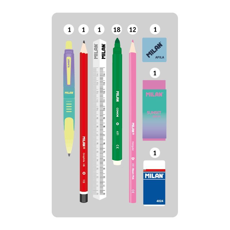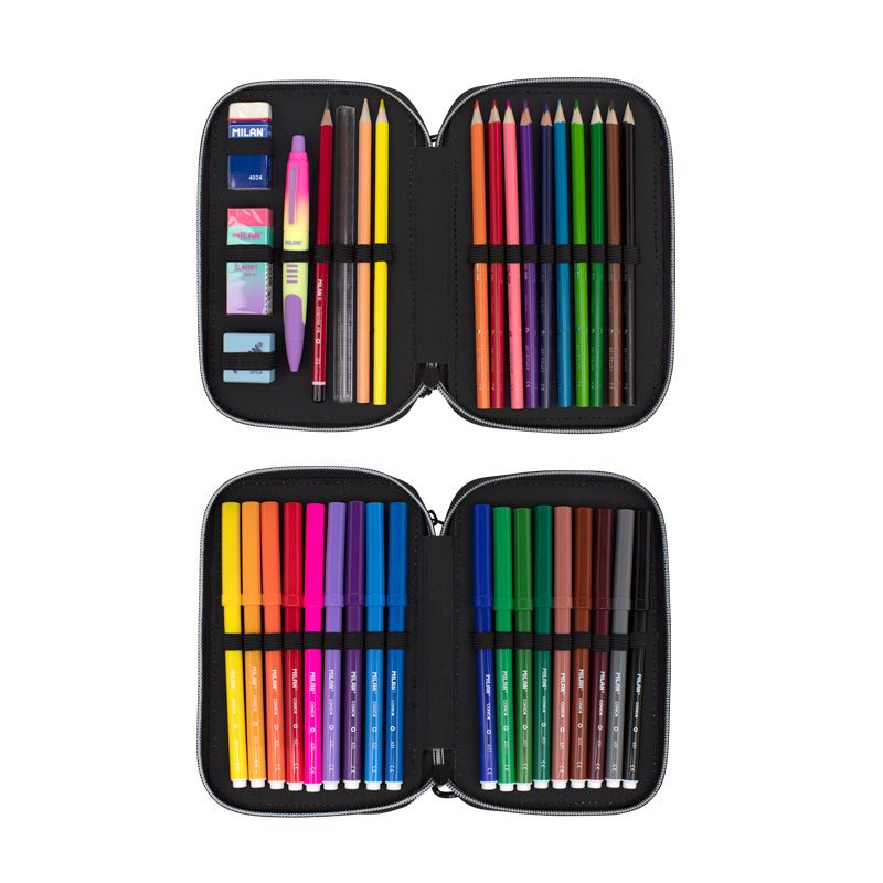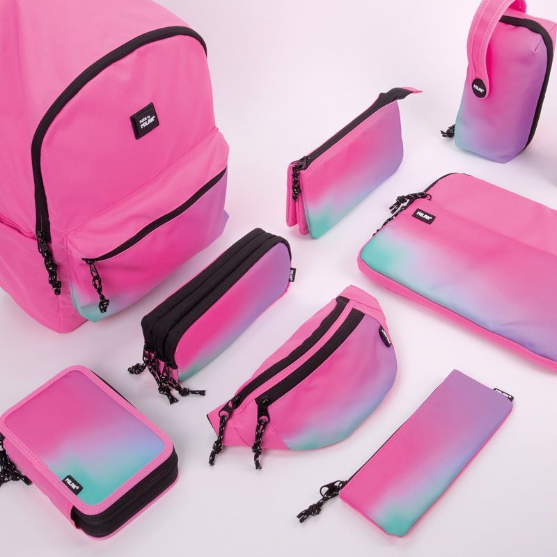 Piónik 2 - poziomowy z wyposażeniem z kolekcji SUNSET w kolorze różowym. Połączenie gradientowych kolorów inspirowanych zachodem słońca z czarno-białymi detalami. Zamek błyskawiczny z cięciwą. Wyposażenie: 12 kredek trójkątnych, 18 flamastrów ze stożkową końcówką, długopis COMPACT SUNSET niebieski, ołówek sześciokątny HB, linijka trójkątna 15 cm, temperówka kwadratowa AFILA, 2 gumki 4024 i 320SN. Każdy poziom osobno zapinany na suwak. Przy produkcji piórników użyto najlepszych materiałów, bardzo wytrzymałych suwaków oraz wzmocnionych nici. Niepowtarzalne wzornictwo. W piórnikach znajdziesz min.: kredki MILAN przy produkcji których użyto drewna pochodzącego wyłącznie z plantacji, gwarantujących nie używanie drewna z lasów deszczowych. Rysik kredki na całej długości jest przyklejony do drewna co zapobiega jego łamaniu. Dzięki trójkątnej budowie kredka jest ergonomiczna i wygodnie trzyma się dziecku. Flamastry MILAN posiadają wytrzymałą i elastyczną stożkową końcówką, która nie wpada do środka nawet przy silnym nacisku. Po chwilowym odkształceniu końcówka zawsze wraca do pierwotnego kształtu. Tusz na bazie wody. Flamastry nie zawierają ftalanów, metali ciężkich i innych. Temperówkę z bezpiecznym przykręconym ostrzem dzięki czemu ostrze nie oddzieli się od obudowy temperówki. Gumkę z naturalnym kauczukiem. Tkanina zewnętrzna „Ripstop”: lekka i odporna na rozdarcia. Wykorzystuje specjalną technikę, która tka grube, wzmacniane nici w regularnych odstępach, tworząc wzór krzyżowy. Materiał zewnętrzny i wewnętrzny 100% poliester. Rozmiar: 19,5 x 13 x 5 cm.