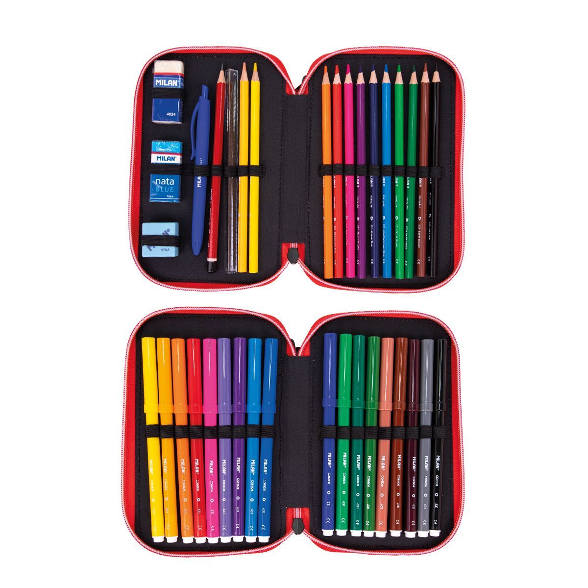 Piórnik 2 - poziomowy z wyposażeniem, który pozwala utrzymać przybory szkolne zawsze w porządku i łatwo dostępne. Seria specjalna Vikings. Dzielni wikingowie gotowi do wypłynięcia w swoich długich statkach typu drakkar. Wzory etniczne i obrazy z tamtego czasu są nadrukowane na szarym tle, w połączeniu z białymi i czerwonymi paskami przypominającymi żagle statków wikingów. Zawartość w zestawie: 2 gumki (4024 i 7024B), 1 temperówka AFILA, 1 ołówek grafitowy HB, 1 niebieski długopis COMPACT, 1 trójkątna linijka 15 cm, 12 trójkątnych kolorowych ołówków, 18 flamastrów ze stożkową końcówką. Przy produkcji piórników użyto najlepszych materiałów, bardzo wytrzymałych suwaków oraz wzmocnionych nici. Niepowtarzalne wzornictwo. Materiał zewnętrzny i wewnętrzny 100% poliester. Rozmiar piórnika: 19,5 x 13 x 5 cm. iem.