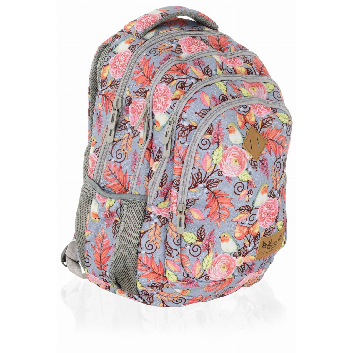Czterokomorowy plecak młodzieżowy Hash z motywem kwiatów i ptaszków wyposażony w przegrodę na laptopa, wyjście na słuchawki i kieszonkę na urządzenie mobilne spełni wymagania każdego nastolatka. Usztywnione gąbką plecy i miękkie szelki zapewniają komfortowe użytkowanie. Organizer z kieszonką w pierwszej komorze pomoże Ci uporządkować klucze, przybory i inne drobiazgi.