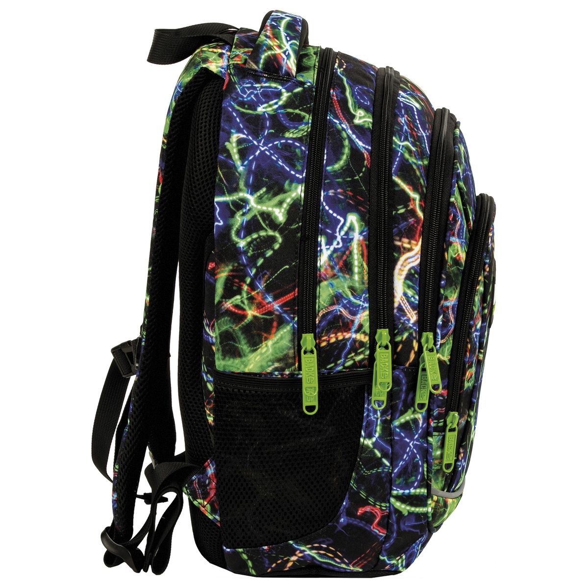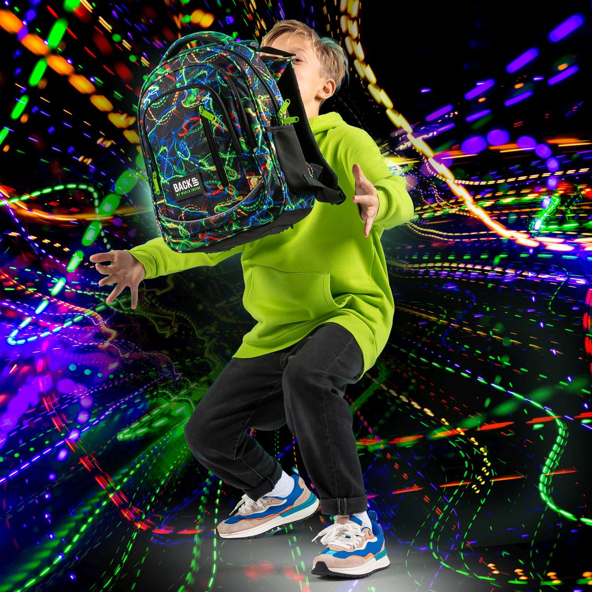 Pulsujące światła neonów, tańczące w szalonym rytmie. Kolekcja Lights to wirujące połączenie żywych kolorów zieleni, czerwieni i granatu na kontrastującym, czarnym tle materiału. Przepełniony energią, zawrotną szybkością, dynamiką i pasją, to plecak dla chłopca, który nie boi się wyzwań, pokonując je z pędkością światła. Plecak BackUP posiada: - 4 komory