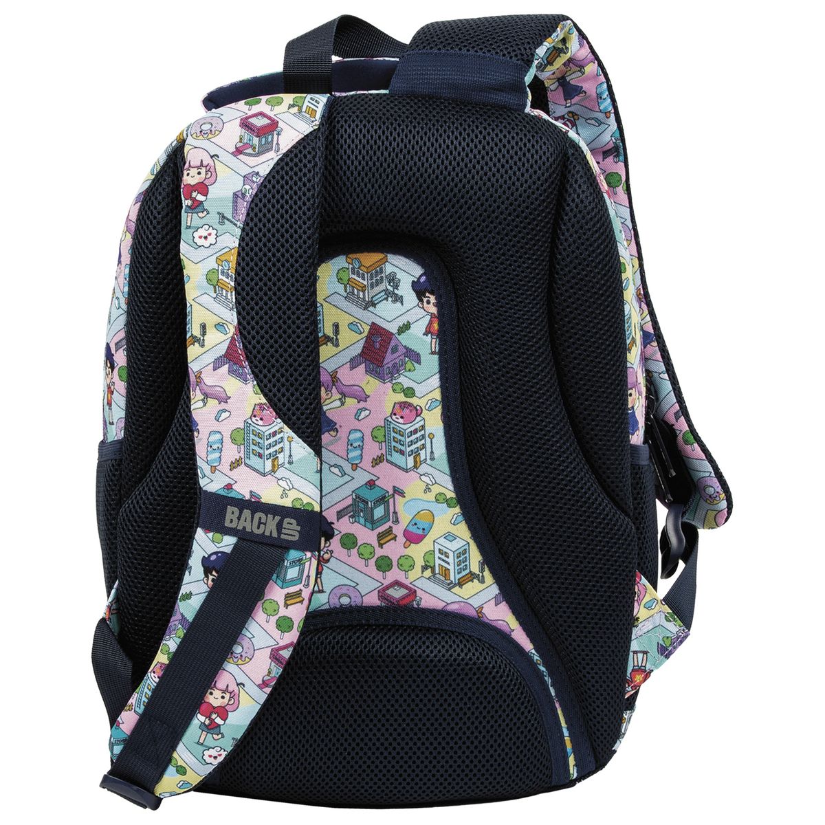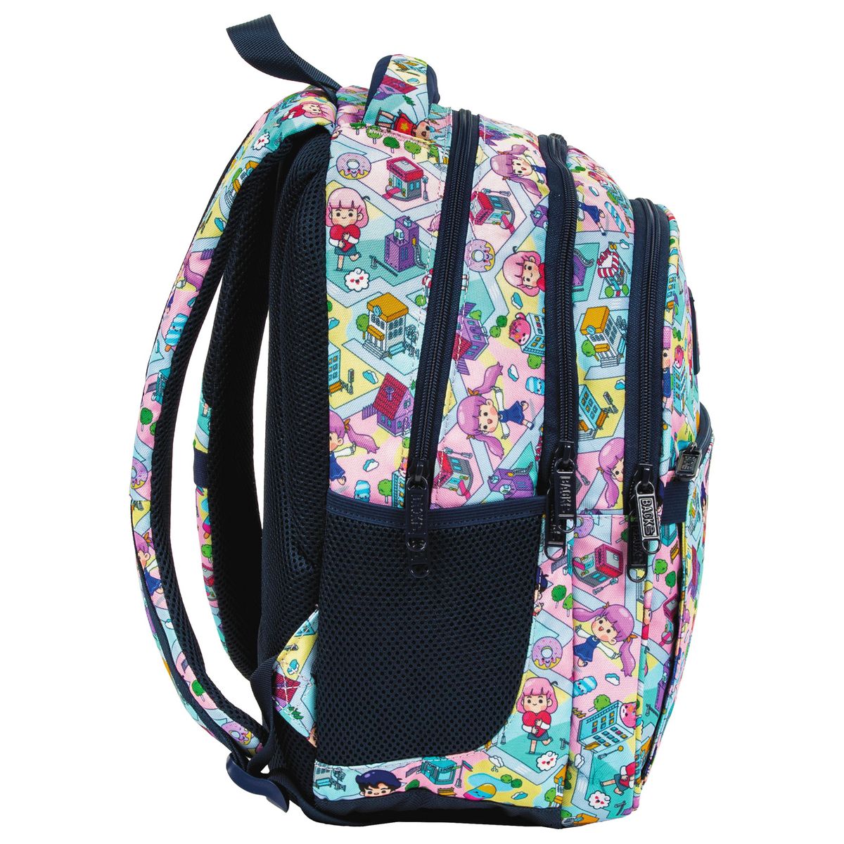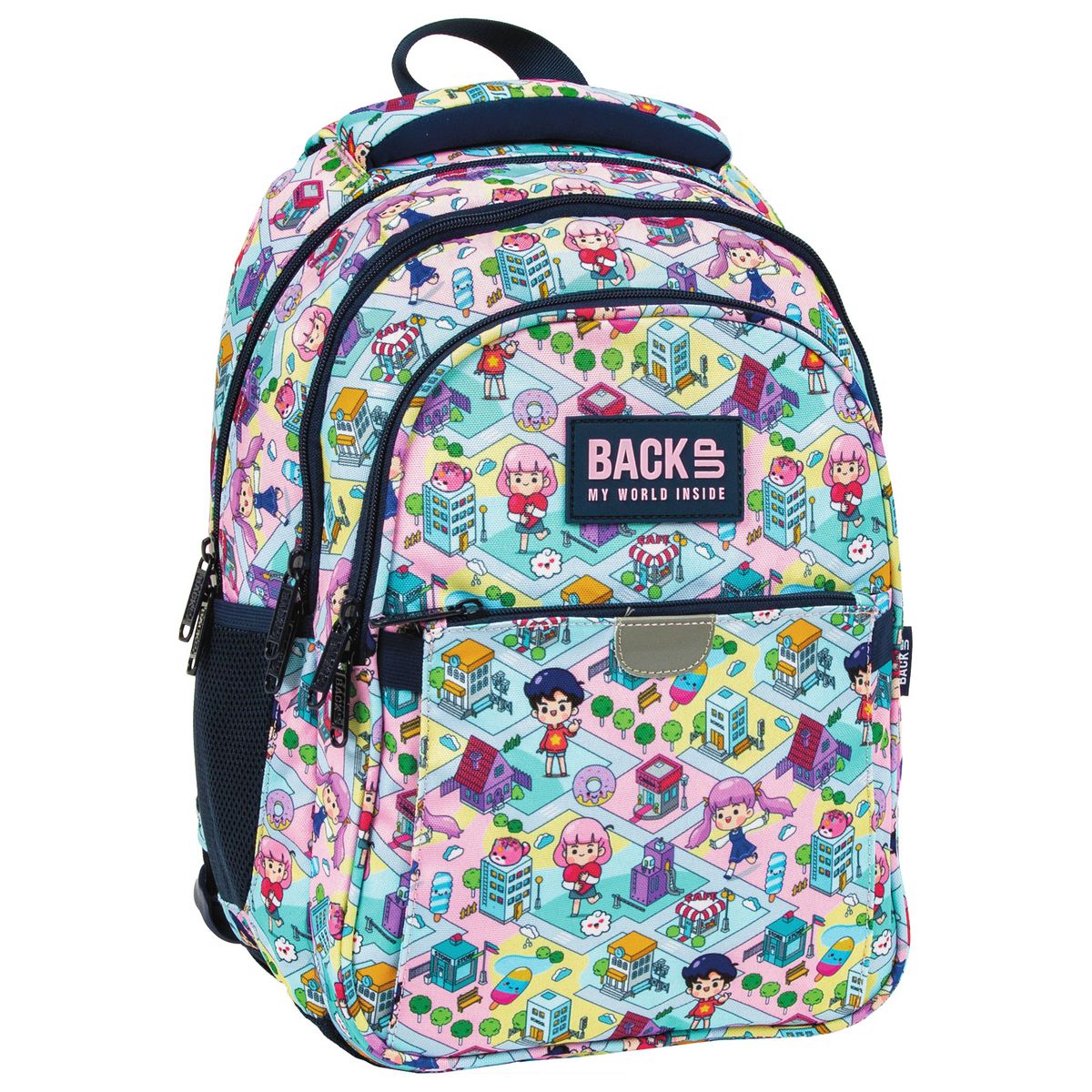 Pastelowy świat gry przeniesiony prosto na plecak BackUP! Barwne postacie przemierzają miniaturową, zabawną krainę , napotykając na swojej drodze słodkie donuty, kolorowe lody i urocze zwierzaki. To, w połączeniu z granatowymi detalami tworzy wyjątkową, dynamiczną kompozycję. Plecak z kolekcji Doll Game stworzony został z myślą o najmłodszych fanach słodkiego stylu - kawaii. Dopasowany do drobnej postury dziecka, jest to idealny plecak dla pierwszoklasisty. Plecak BackUP posiada: - 3 komory