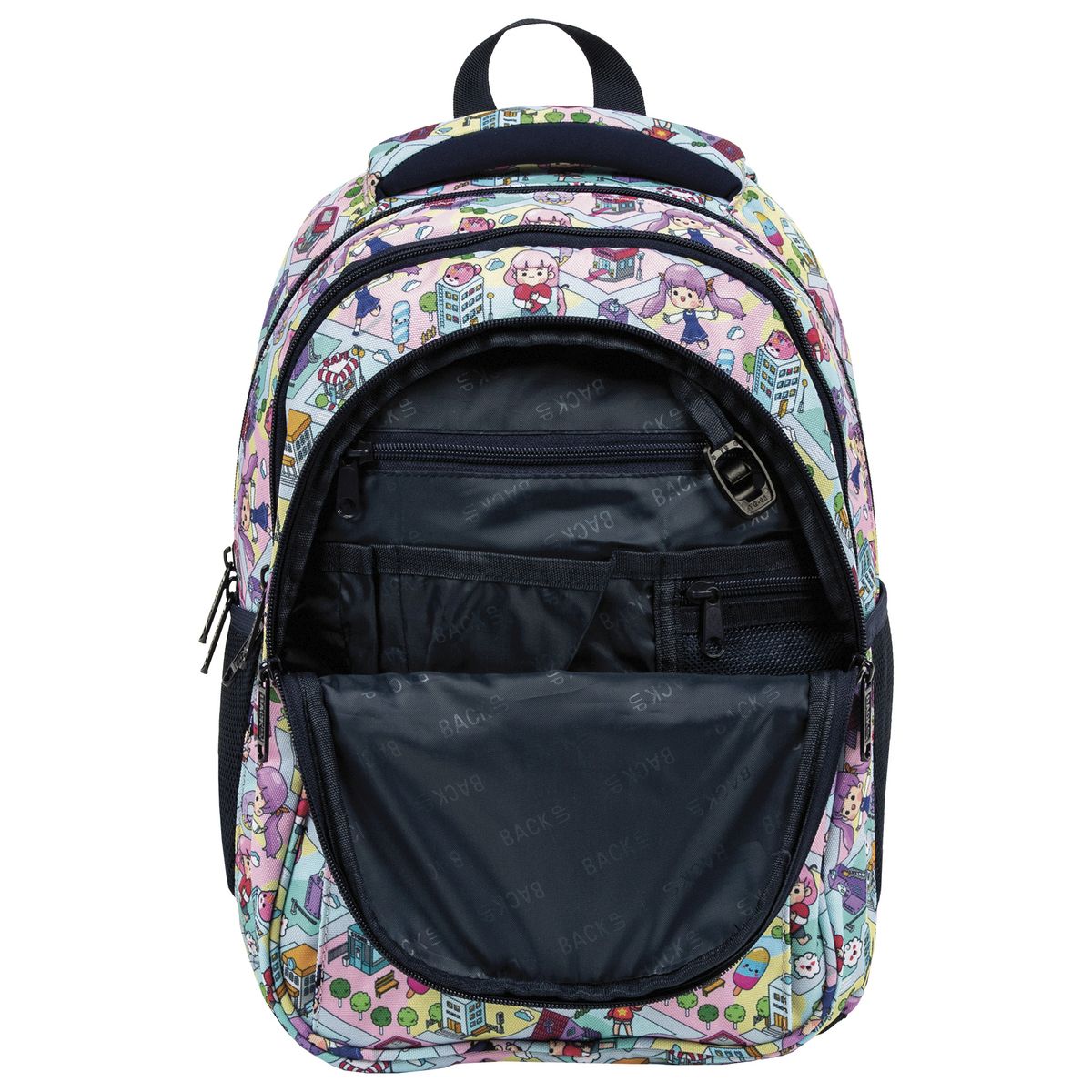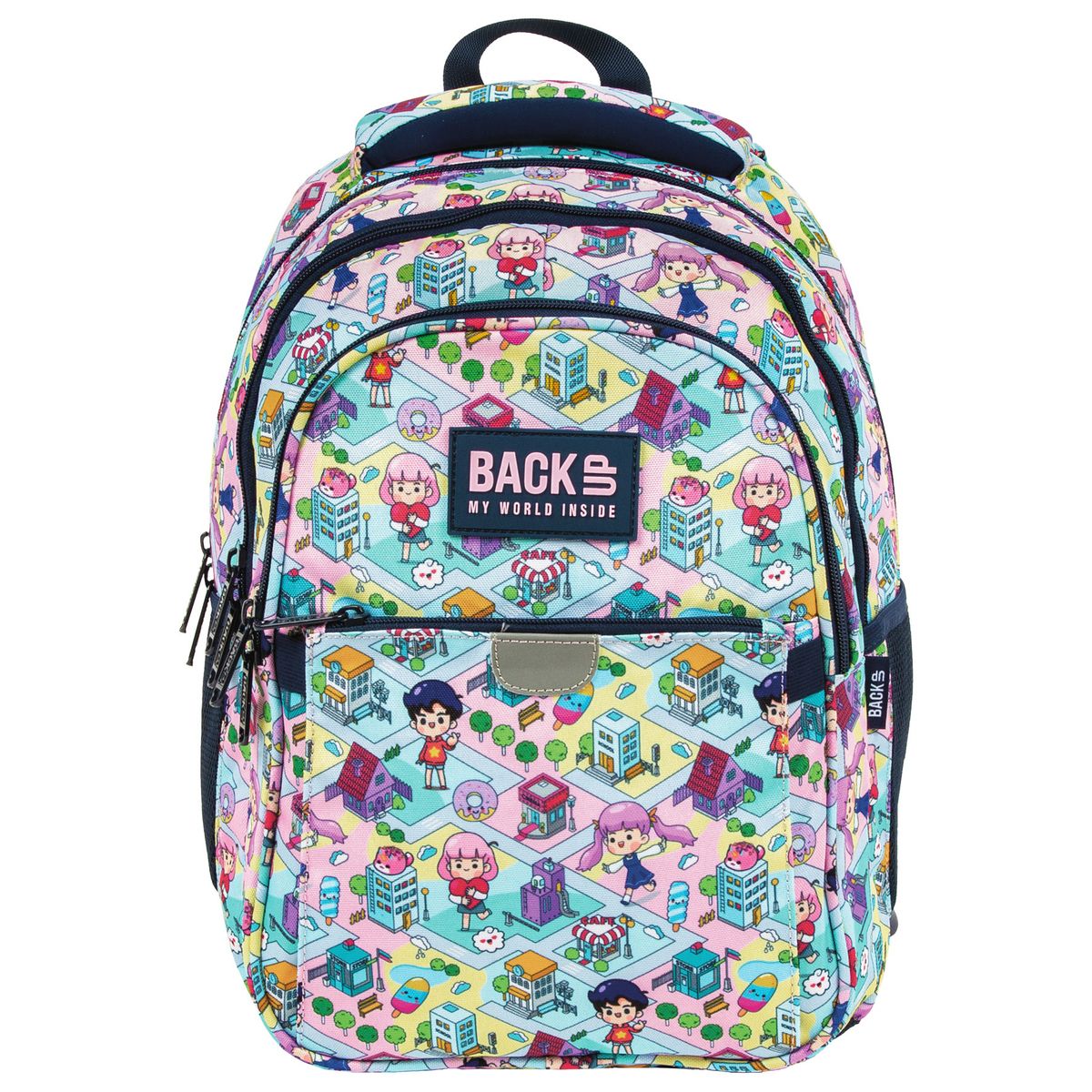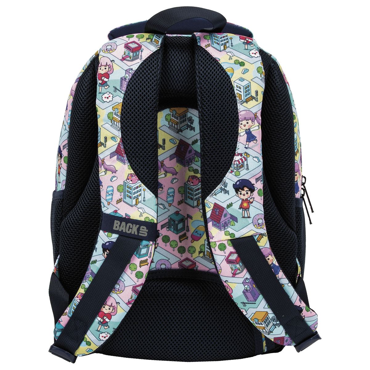 Pastelowy świat gry przeniesiony prosto na plecak BackUP! Barwne postacie przemierzają miniaturową, zabawną krainę , napotykając na swojej drodze słodkie donuty, kolorowe lody i urocze zwierzaki. To, w połączeniu z granatowymi detalami tworzy wyjątkową, dynamiczną kompozycję. Plecak z kolekcji Doll Game stworzony został z myślą o najmłodszych fanach słodkiego stylu - kawaii. Dopasowany do drobnej postury dziecka, jest to idealny plecak dla pierwszoklasisty. Plecak BackUP posiada: - 3 komory