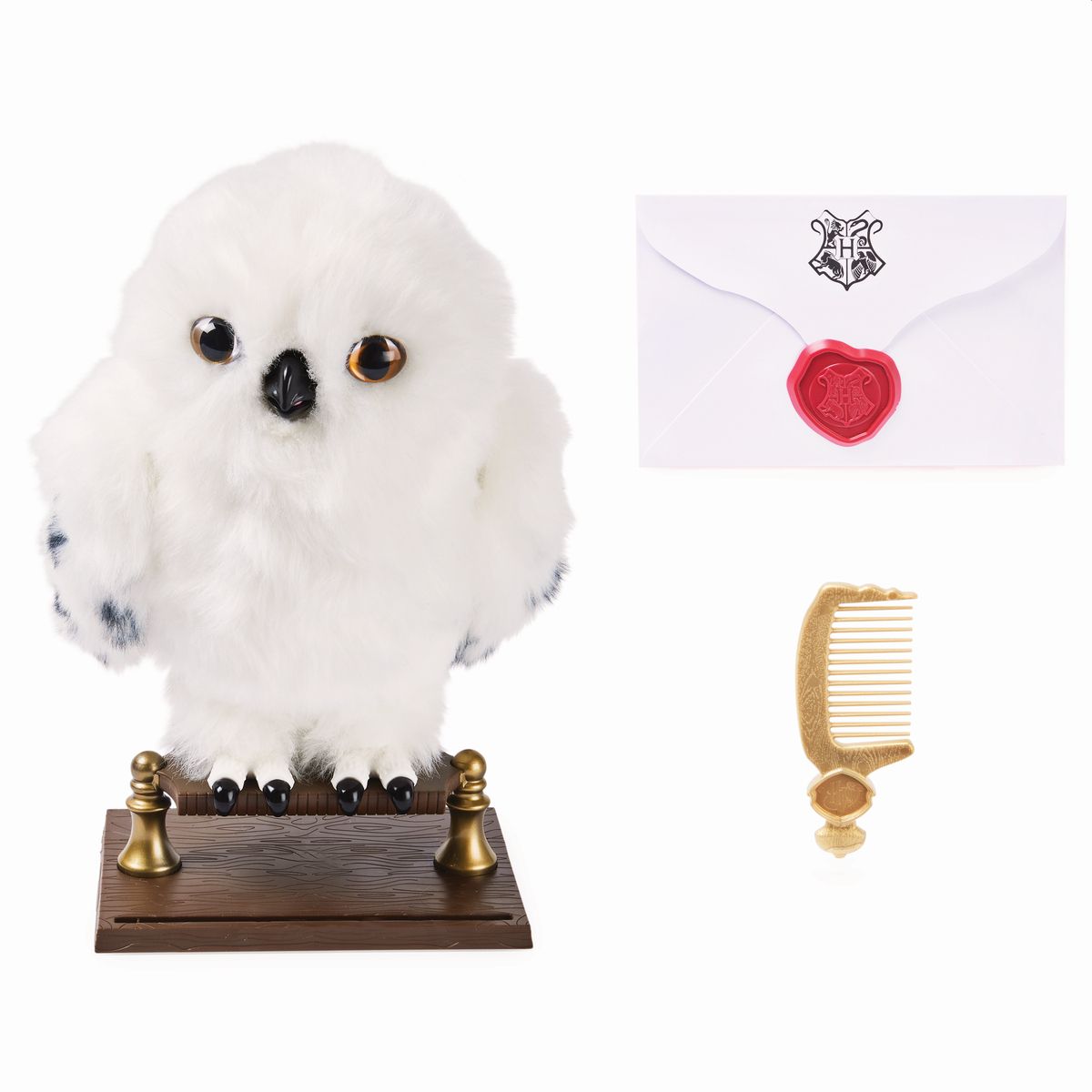 Odtwórz swoje ulubione sceny z Harry'ego Pottera dzięki uroczej Hedwidze od Wizarding World. Dzięki ponad 15 realistycznym odgłosom, ruchom i supermiękkiemu, pluszowemu materiałowi, urocza Hedwiga ożywia emocje związane z tą kultową sową. Zdejmij Hedwigę z grzędy i odkryj jej wszystkie magiczne cechy. Dzięki specjalnym czulnikom może wyczuć, w jaki sposób ją głaszczesz. Aby zaćwierkała i poruszała głową, pogłaszcz ją od przodu do tyłu. Nie lubi, gdy jej piórka są stroszone, dlatego da Ci o tym znać. Poza tym włóż palec w jej dziób, a będzie go skubać, jeśli jest szczęśliwa. Urocza Hedwiga umie również rozpoznawać ton Twojego głosu. Jeśli mówisz cicho i delikatnie, odpowie huczeniem na znak, że Cię słucha. Jeśli będziesz mówić głośno, ona też tak odpowie! Odstaw z powrotem Hedwigę na żerdzi i napisz specjalną wiadomość do przyjaciela. Wsuń list do koperty Hogwartu i pomóż sowie dostarczyć wiadomość. Będzie trzymała kopertę w dziobie i odda ją jedynie temu, kto zna sekretny kod. Pogłaszcz ją trzy razy po głowie, a od razu przekaże przesyłkę. Pogłaszcz ją, żeby była szczęśliwa, a potem możesz wysłać kolejną wiadomość. Dzięki tak wielu ekscytującym funkcjom ta 9-calowa czarująca sowa zainspiruje Twoją wyobraźnie do niesamowitej zabawy. Interaktywna pluszowa Hedwiga to doskonały prezent dla dzieci od 5 lat. Zabierz do domu swoją własną Hedwigę od Wizarding World i poznaj magię świata Harry'ego Pottera!