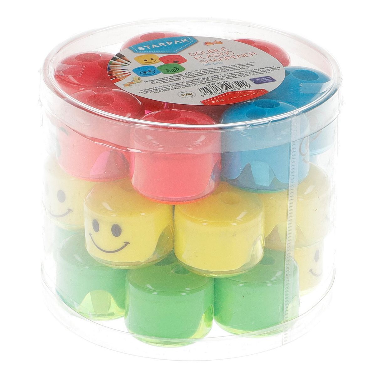Zalety produktu: Temperówka z zasobnikiem na strużyny, w formie kubeczka z wesołymi minkami. Posiada 2 ostrza do ostrzenia kredek i ołówków standardowych, oraz w rozmiarze jumbo. Dostępne w czterech kolorach: czerwona, zielona, żółta oraz niebieska. Wymiary produktu wys. x szer cm : 3x3,5. Wymiary opakowania dł. x wys. x gł. cm : 13x11x13. Waga produktu kg : 0,01 kg. Waga w opakowaniu kg : 0,32 kg. Temperówki pakowane w przeźroczystą tubę po 24 szt. Pakowane w kartonie po 72/288 szt.