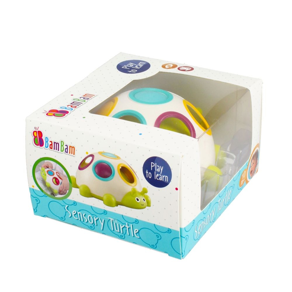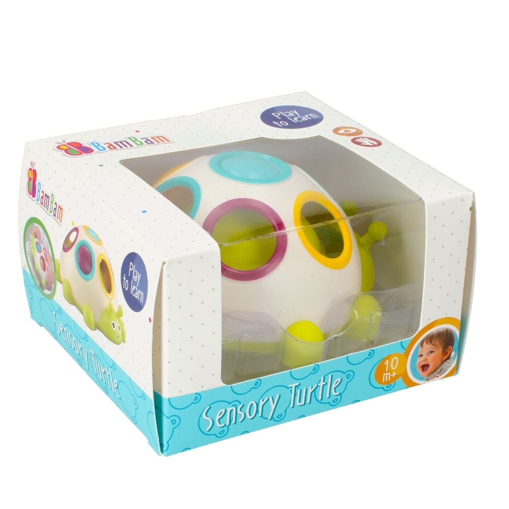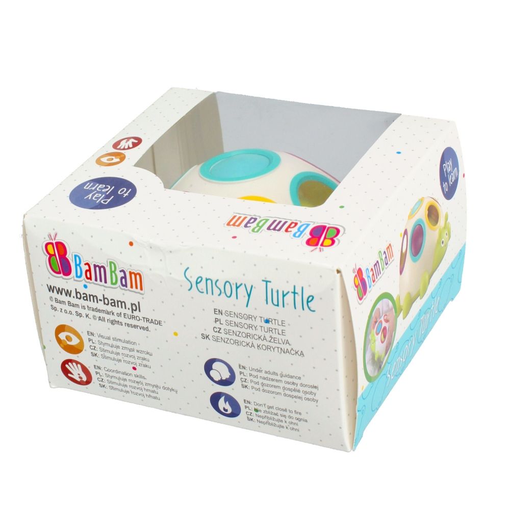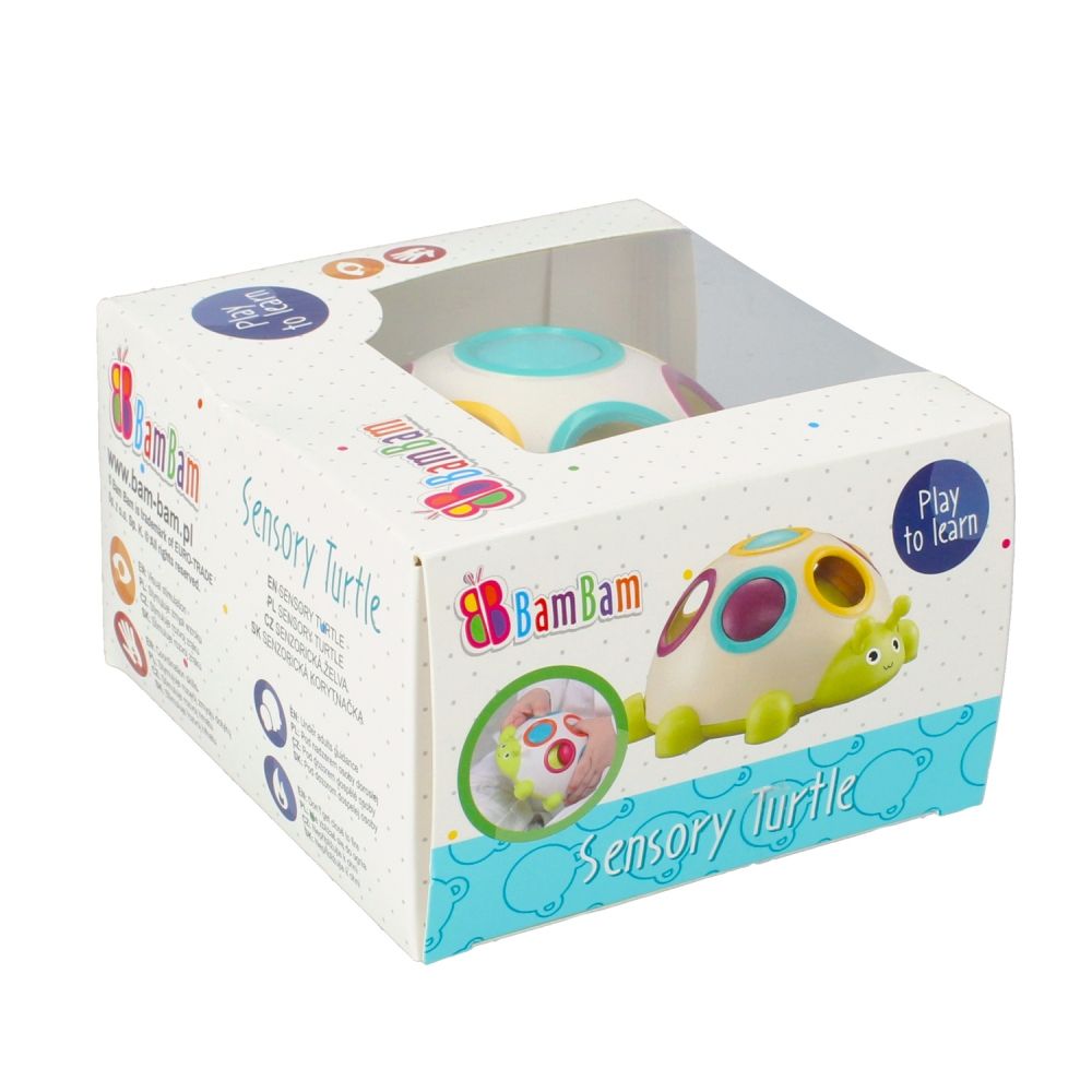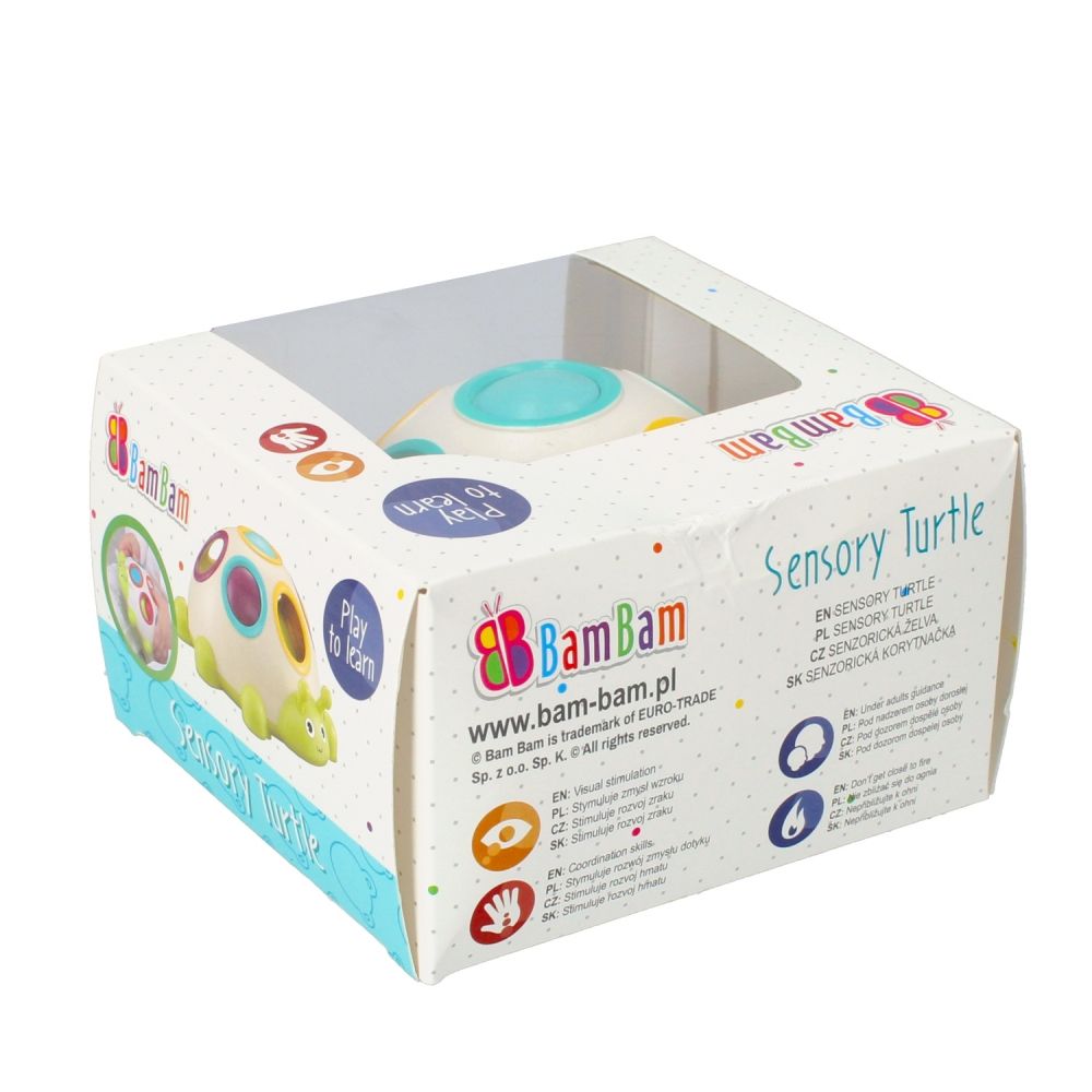 Sensoryczny Żółwik Bam Bam to zabawka edukacyjna, zapewniająca masę wrażeń i doznań zmysłowych dla malucha. Postać jeżyka z wypukłymi, kolorowymi półkulami umożliwia wspieranie rozwoju zdolności manualnych, motoryki małej i zręczności. Różnorodne materiały i tekstura stymulują wrażliwość dotykową dziecka i pozwalają mu zrozumieć ich różnorodność. Możliwość przesuwania kolorowych półkul i dopasowania ich kolorystycznie do odpowiednich obręczy wspiera abstrakcyjne myślenie, uczy zasad logicznego myślenia i zależności. Zabawka wykonana z najwyższej jakości materiałów, bez ftalanów, zgodna z normą EN- 71 oraz CE, zapewniająca bezpieczną zabawę. Wymiary/waga/baterie: wymiary produktu dł. x wys. x gł. cm : 12x6x11, wymiary opakowania dł. x wys. x gł. cm : 13x8x12, waga produktu bez opakowania kg : 0,07 kg, waga produktu bez opakowania kg : 0,11 kg, nie wymaga zasilania bateriami. Zabawka przeznaczona dla dzieci w wieku: 10m . Pakowana w kartonik z okienkiem.