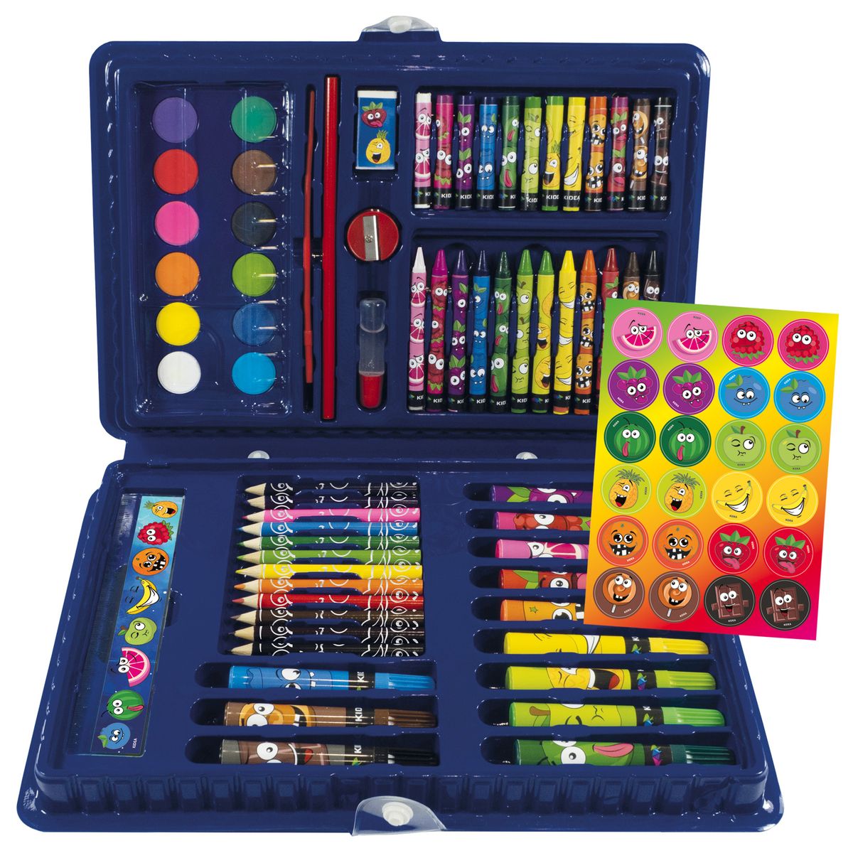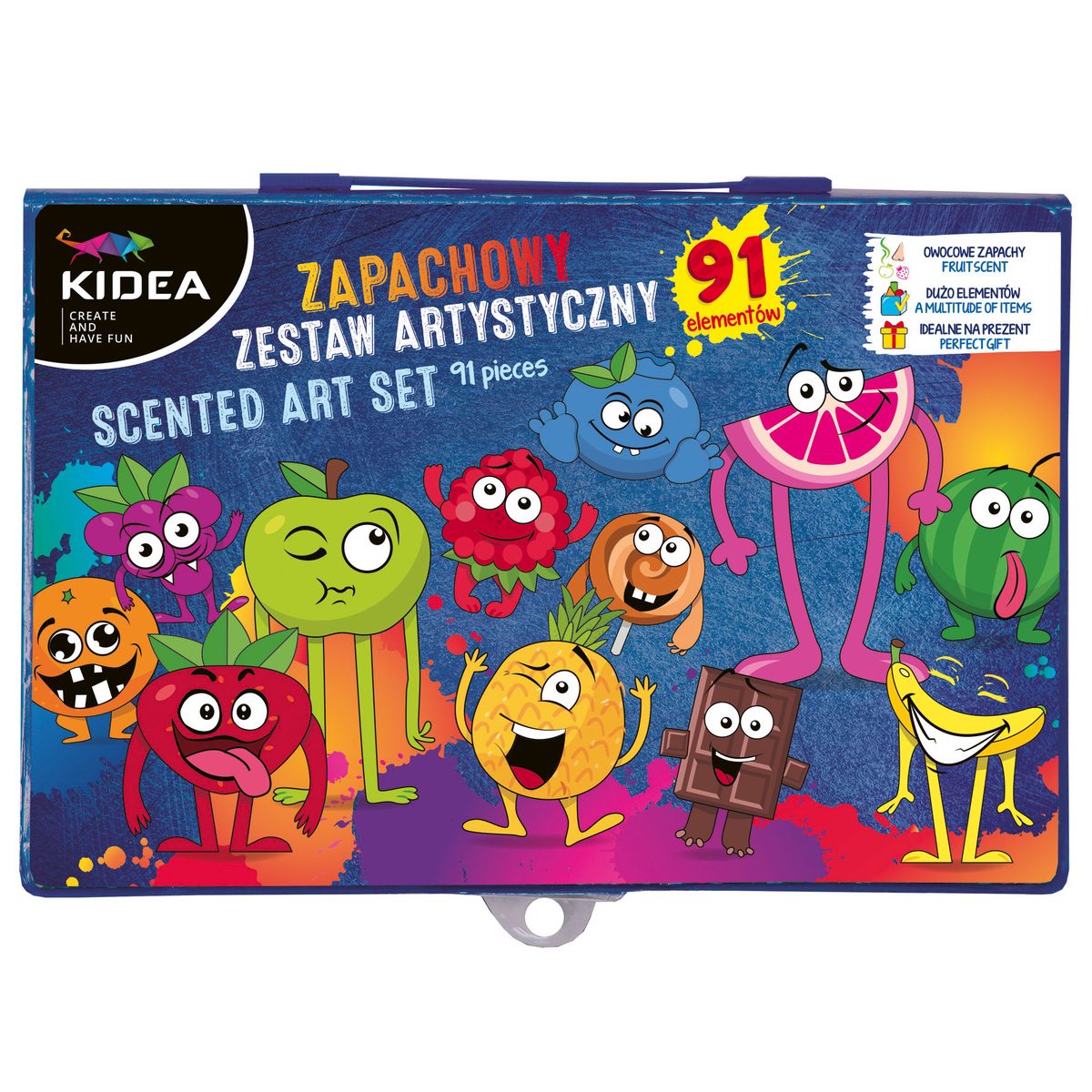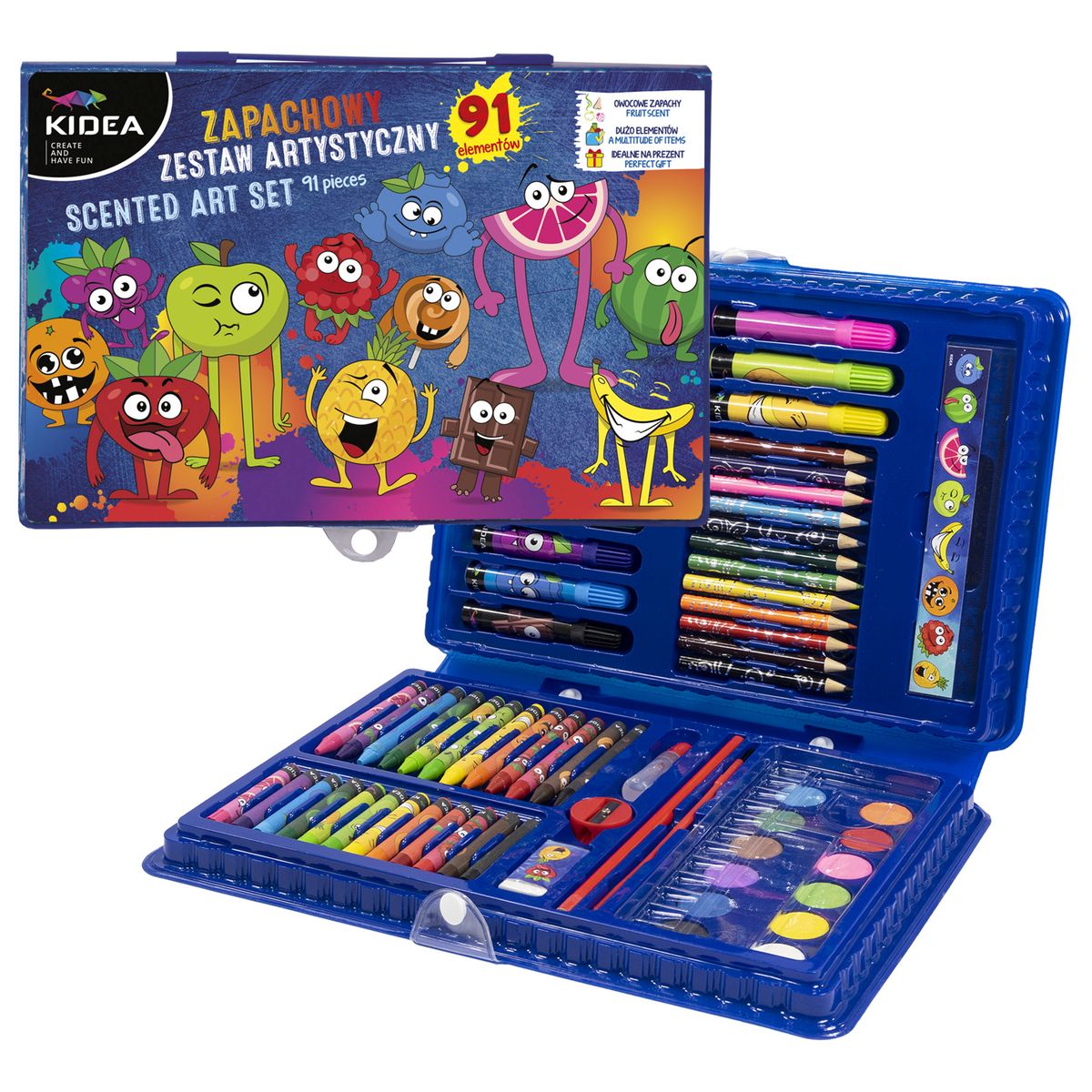Funkcjonalny, zapachowy zestaw artystyczny w eleganckiej walizce. Cały komplet posiada, aż 91 niezbędnych elementów. Zestaw zawiera 12 zapachowych kredek, 12 pisaków, 12 pasteli, 12 kredek woskowych, 24 naklejki, 12 farb akwarelowych, paletę, pędzel, linijkę, gumkę do mazania, temperówkę, klej i ołówek. Dodatkowym atutem jest zapach, który uatrakcyjnia produkty i sprawia, że dzieci chętniej po nie sięgają. Po otwarciu walizki każde dziecko momentalnie zakocha się we wszystkich artykułach jak i w owocowym zapachu. Zestaw ten zawiera wszystkie akcesoria niezbędne do tworzenia niezwykłych prac plastycznych. Idealnie sprawdzi się jako prezent dla małego artysty.