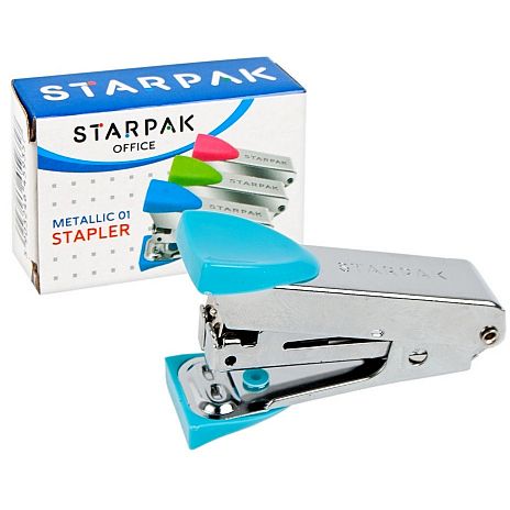 Zszywacz z kolekcji Starpak dedykowanej dla szkoły i biura. Kieszonkowy zszywacz o nowoczesnym designie. Zszywa jednorazowo do 10 kartek gramatury 80 g/m2. Do zszywacza należy stosować zszywki No. 10. Magazynek mieści 50 zszywek. Głębokość zszywania - 30 mm. Zapoznaj się również z innymi produktami Starpak dedykowanymi dla szkoły i biura Produkt nieodpowiedni dla dzieci poniżej 3 roku życia. Pakowany w kartonowe pudełeczko. Wykonany z metalu oraz plastiku. W kolorze niebieskim.